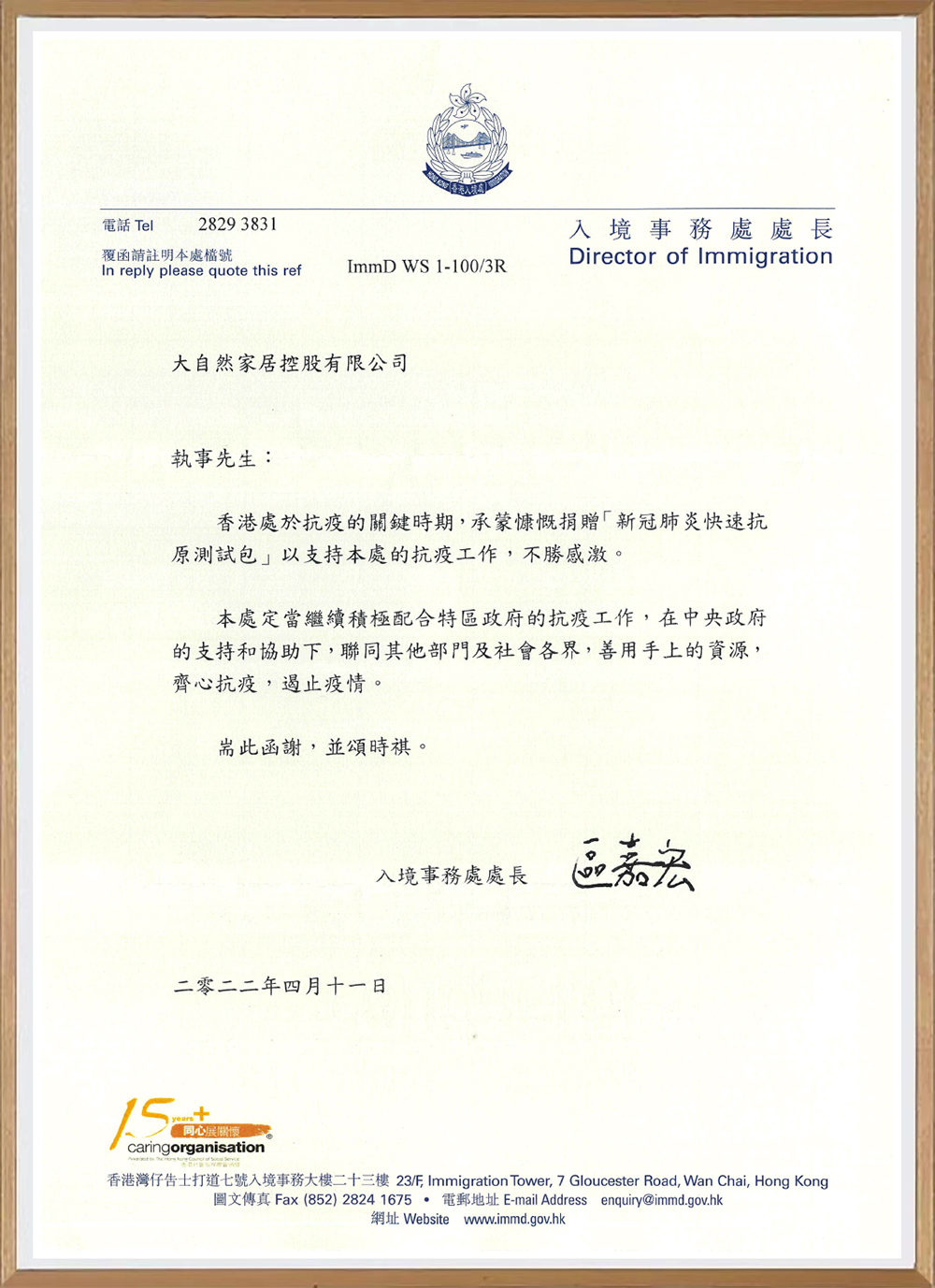 中國香港入境事務(wù)處授予大自然家居感謝信