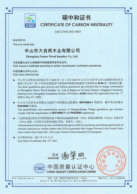 大自然家居率先獲得CQC頒發(fā)的碳中和證書(shū)