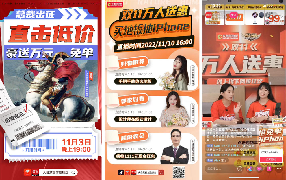 大自然家居將雙11活動(dòng)提前至10月,形成“錯(cuò)峰引流”態(tài)勢(shì),以抖音+微信+天貓/京東作為營(yíng)銷(xiāo)傳播主戰(zhàn)場(chǎng),以節(jié)奏強(qiáng)勁的打法推出“圖文+視頻+軟文+直播”等營(yíng)銷(xiāo)組合拳,以場(chǎng)景化的營(yíng)銷(xiāo)模式,最大程度地吸引用戶(hù)的關(guān)注。