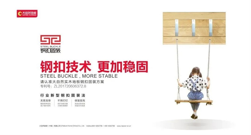 大自然地板歷經(jīng)29載歲月沉淀,在健康家居生活探索屢獲成就,已成為千萬(wàn)家庭的口碑之選。歷年來(lái),大自然地板堅(jiān)持健康環(huán)保的主旋律和產(chǎn)品的創(chuàng)新研發(fā)。歷時(shí)3年潛心研發(fā),大自然地板研發(fā)團(tuán)隊(duì)終于取得重要突破成果 ——“鋼扣固裝方案”,通過(guò)特制的合金材質(zhì)鋼扣,與地板底部精心規(guī)劃的槽口緊密扣合,利用鋼扣弧形結(jié)構(gòu)的預(yù)應(yīng)力,使地板拼接保持在一個(gè)穩(wěn)定的關(guān)聯(lián)狀態(tài),科學(xué)地控制地板干縮濕脹,解決了實(shí)木地板的起拱和起縫問(wèn)題,地暖和非地暖環(huán)境都適用,給家居生活帶來(lái)穩(wěn)穩(wěn)的保障。正是對(duì)地板的持續(xù)創(chuàng)新,大自然地板榮獲世界市場(chǎng)調(diào)查機(jī)構(gòu)歐睿國(guó)際認(rèn)證的連續(xù)四年全國(guó)實(shí)木地板銷量第一的稱號(hào)? ,得到消費(fèi)者的認(rèn)可。??