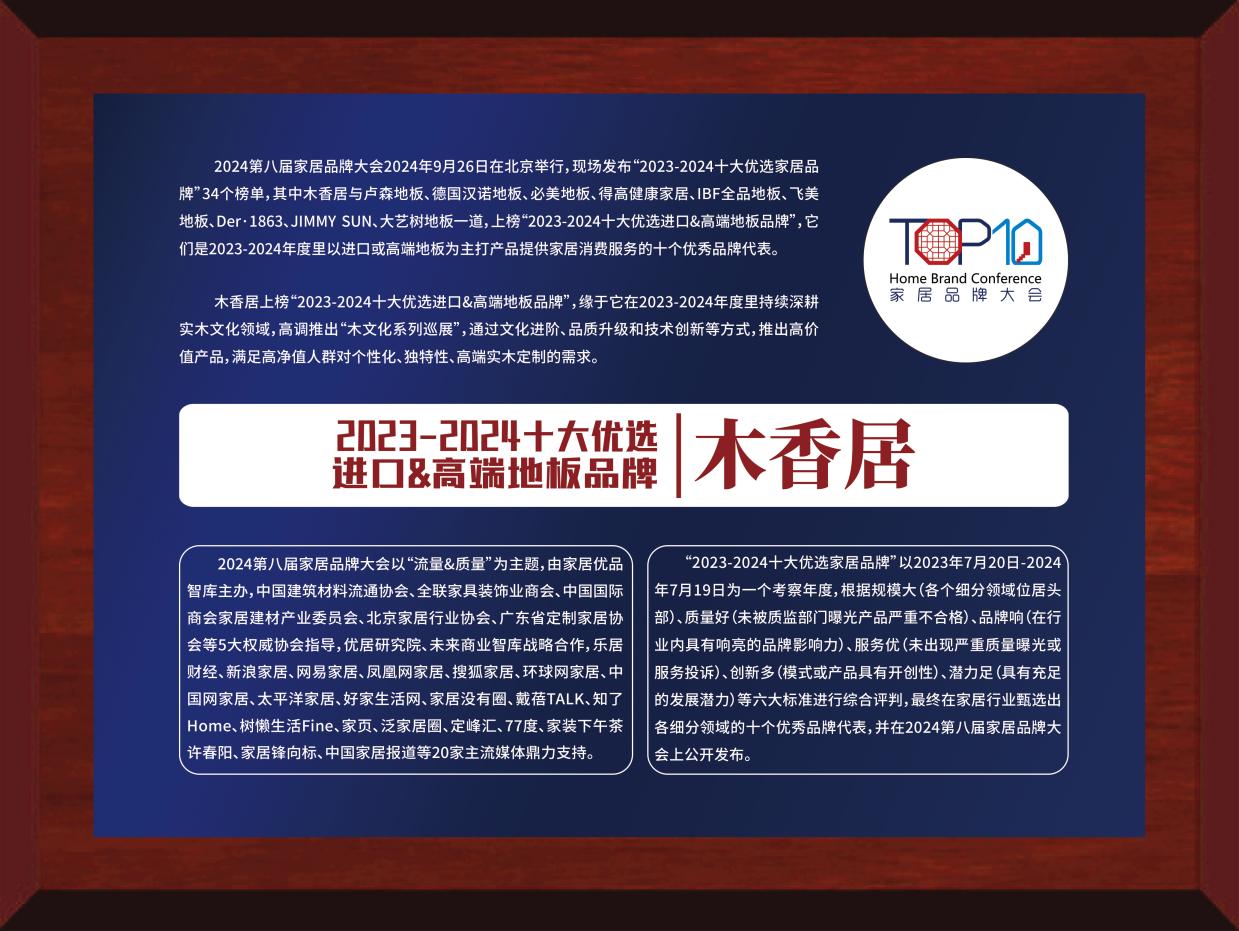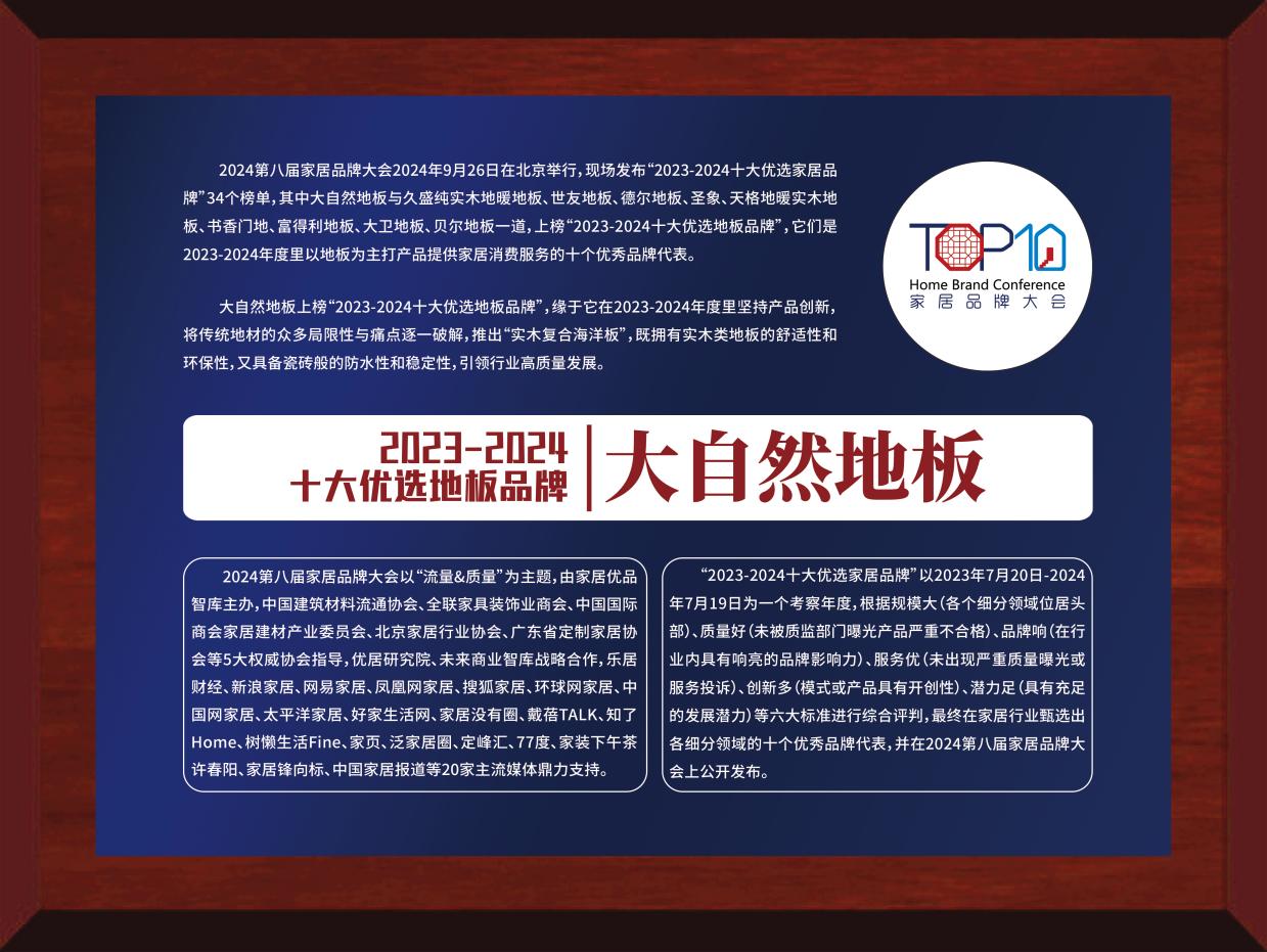 近日,2024年第八屆家居品牌大會于北京成功舉辦,并同步發(fā)布“2023-2024家居十大優(yōu)選品牌”榜單。其中,大自然家居榮獲“2023-2024十大優(yōu)選地板品牌”、大自然家居旗下高端品牌木香居榮獲“2023-2024十大優(yōu)選進口&高端地板品牌”。